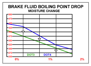 The DOT specifications are based on the concept of wet and dry boiling points. The dry boiling point is applicable when fluid is fresh and the wet boiling point after the fluid has been exposed to moisture and has had the opportunity to adsorb water. The minimum values for the wet and dry boiling points are specified for each DOT level, and increase from 3 through 5. See the graph below right for wet boiling points (DOT 4=blue) Note that these are minimum values, and there is no constraint on by how much a manufacturer may exceed them. To achieve a DOT rating, the fluid must meet both dry and wet boiling point specifications. In addition to DOT level, another important consideration in selecting a brake fluid is the presence of anti-corrosion additives, commonly found in street fluids but not in track fluids. Note that Volvo ABS-equipped cars must have brake fluids flushed every two years to remove moisture, renew additives, and prevent corrosion.