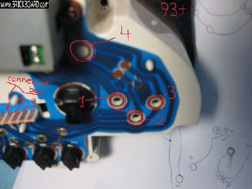 Separate the screw that goes to connector 2 (the number is circled in the illustration but does not appear on any circuit diagram) of the gauge from the print on the instrument cluster circuit. As you can see on the photo above there is connection between point 2 and 3 (circled) on the 92 instrument cluster circuit. You need to separate those two since newer gauge (93+) has sensor connector at point 2 and the old one is at 4. So I fabricated a small sleeve about 3mm long and a plastic or nylon washer and then on top of it I have placed a wire loop circuit that I have connected to the point marked by X on the picture below. This isolates point 2 on the PCB board from the guage and connects point 2 on the gauge directly to point X. From the point X the instrument cluster circuit goes directly to connector #3 on the connector bar (which is the actual number on the connector plug that on the back of the cluster). Connector #4 on the connector goes to number 3 circled in both gauges. As you can see on the picture of 92 instrument cluster circuit there are two soldering points between circled 3 and 4. This is the duplicate capacitor that I have pulled out since, electrically speaking, the same capacitor is between those two points on the 93 gauge circuit.