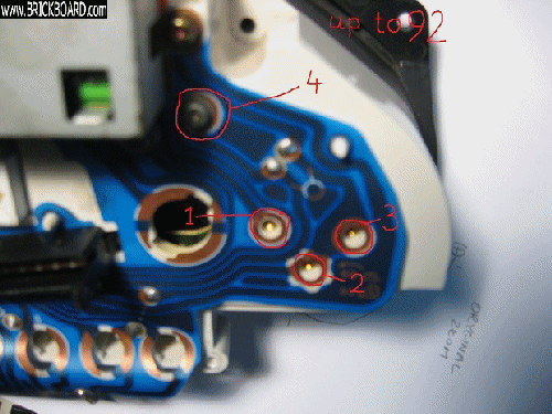 The alteration of the circuit board on the 93/94 cluster is the next step. Sever each of two traces by removing a portions with a razor blade knife. Make four small cuts on each trace and that section of the board will fall away.