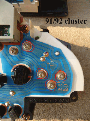 There is a capacitor in the area of the fuel gauge on the circuit board of the 91-92 cluster. It must be removed and then installed on the 93-94 circuit board. The capacitor from the 91-92 board is soldered into place on the 93-94 board.