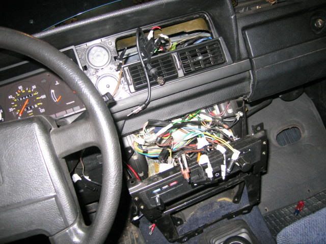 For even more fun, try relocating the stereo to the bottom of the dash in a later 240 with the shallow pocket. Requires removing the amp completely and cutting a DIN-sized slot in the back of the pocket, plus finding a lower radio plate. I guess you could use a Crutchfield harness with really long leads off the headunit, but I wired the entire stereo independently from the factory system, including a 10-gauge fused power wire directly to the battery (this Alpine headunit spikes at 60Wx4 channels).