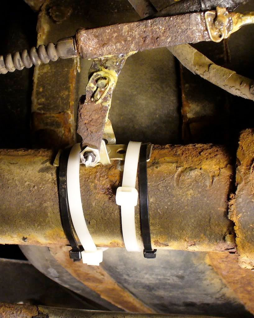 The "U" and strap are from cheap perforated stock, rivetted where they join. The old remnants were ground off the axle housing, then black zip ties were used for initial positioning followed by the big white ones.