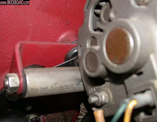 I used the stock bracket mounted to the block with the stock hardware. The modifications were an Alum. 1" round bar with a .375" hole thru it, cut to just fit between the "ears" of the bracket. This lets the stock bracket share the vibration and loads on both ends. 3/8-16" all thread goes thru this, the alt. and the bracket (Use Nylock or some such nuts). The alternator is modified by removing about .375" from the rear of the bottom mount boss, it is the same unit I was running on my B18b 122. There is the same relationship between the bracket location and the waterpump pully on all the red block engines until the factory started installing the alts. on the B20s (1970?).
