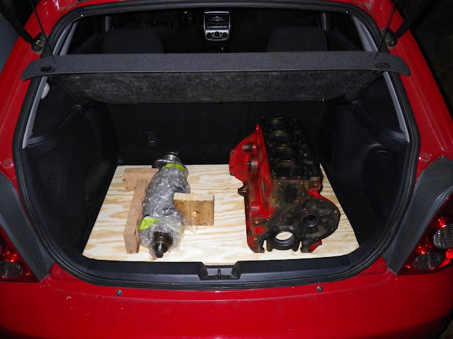 Got the block, crank, and pistons loaded Sunday night up and hauled into the machine shop yesterday. A scrap of 3/4" ply worked pretty well to spread out the load. Screwing through the oil pan holes with drywall screws to secure it, a tip I got on here, worked great as well. The guy at the machine shop was pretty impressed when I whipped out the little Bosch 12v litheon dril/driver to get the block off the plywood. The crank is just trapped by some 2x4 scraps to keep it stationary.