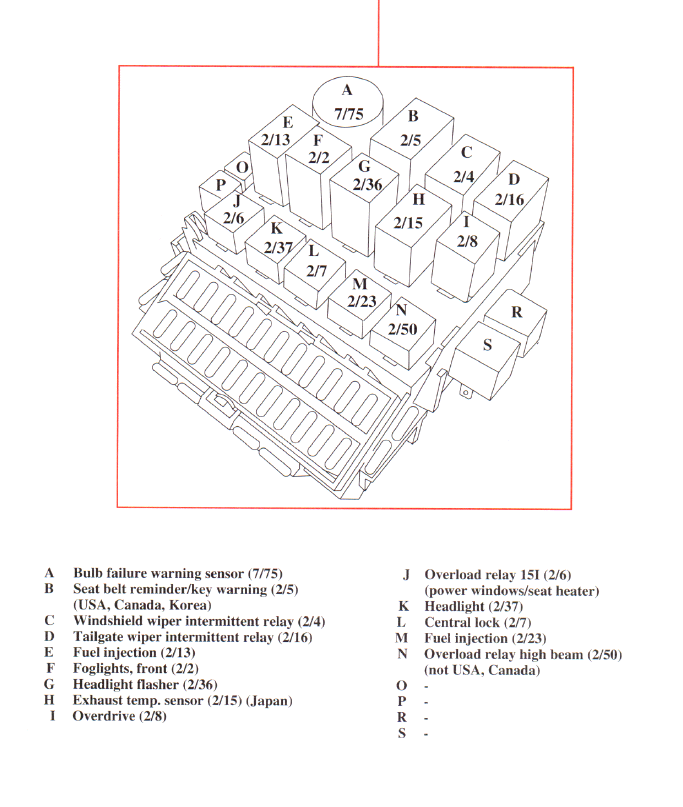 there is a small (approximately 1”x1”x1”high) blue one to the far right (passenger side) position in the front (closest to the shift lever) row. In the immediate left position of the front row is a black (1”x 1” x 1”high) with the letter “J” on it, then second, a silver (1”x1”x1”high) with what seems to be a hand written (black felt tip marker) “K”, then in third position is a larger (rectangular 1”x 2” x 1” high) black relay and then finally the 1”x1”x 1”high blue (made in Spain Hella/Volvo #9130270) to the far right….the location where the large white one should go (according to the photos I’ve been seeing) in the second row is empty….