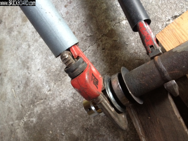 Inserting pipes over the wrench handles give additional leverage. Pieces of wood were used for stability and also keeps the flanges from bending against the floor.