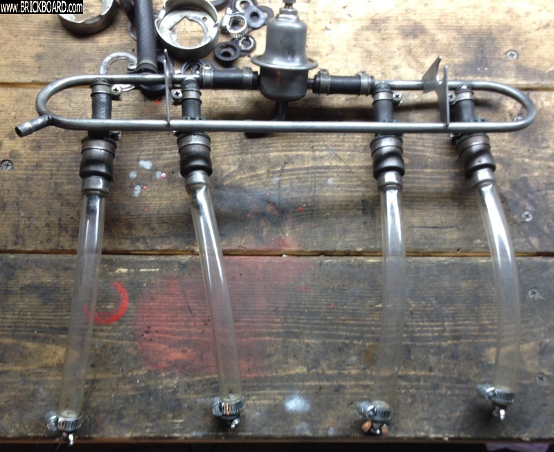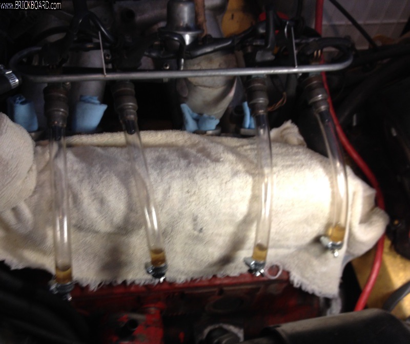 Once the injector rail was all connected back up to the car, I pulled the distributor out of the engine and removed the cap (left the rotor in place). The trigger contact wiring was still connected to the distributor. I turned the ignition on (the fuel pump will run) and spun the distributor rotor as fast as I could with one finger. The injectors will squirt-squirt-squirt. Since there is no vacuum acting upon the manifold pressure sensor (MPS), you will be simulating a command for a highly rich condition. So the tubes should start filling with fuel, and hopefully at an equal rate. If you connect a long vacuum hose to the MPS and you suck the sensor diaphragm down while spinning the rotor, you "may" be able to detect a reduction in injector flow, but don't worry if you can't - this is a rather crude test. Also, by sucking on the MPS port, you can detect if the diaphragm is shot. If the MPS doesn't hold a vacuum it will cause an extremely rich running condition.