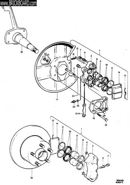 I am continuing with my research into a simple dual circuit brake conversion for all of us single circuit Volvo owners. I have located a Volvo dual curcuit master cylinder, with the help of some fellow brickboarders, that is a direct bolt in. Now I am looking at the front brakes. I was hoping someone out there has a four piston caliper and backing plate from a later model 120 or 1800 that I could borrow for some measurements and comparison. I would be glad to pay S&H (from inside the USA) if I could look at the parts. They do not need to be new or clean, and I will send them back as soon as I have the information I need. It appears from the parts manuals that the four piston caliper will bolt up too older Volvos with the correct backing plate, but I need both parts to confirm this theory.