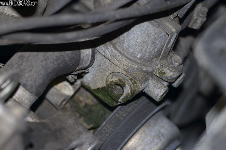 Also, right behind the water pump (if it really is the water pump), and a bit below, there is a very big pipe or hose connected, that goes right below the engine block, and the connector is very corroded and messed up.