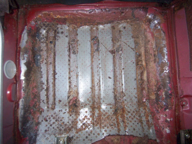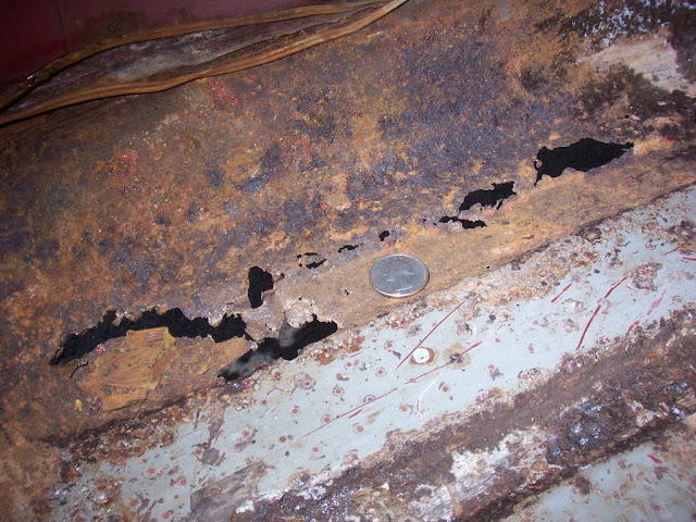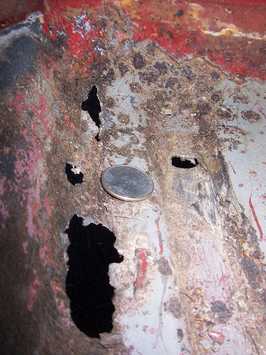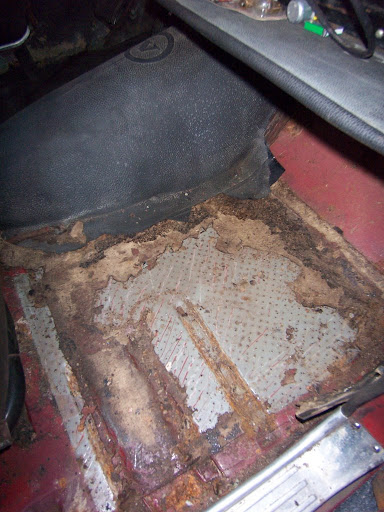 Finally . . .the heart-sinker. The drivers side rear floors have some significant rust-through in the rear out corner as well. It seems like the frame rail and structural members adjacent have been spared. Again, the problem seem largley confined to the rear corer of the rear footwell.