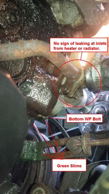 Coolant loss is recent, and the "Slime" seems to be at the front of the motor. That is, there's no evidence at the back (Heater valve) or from pump itself (installed several months ago by Ted). Pump top gasket, block gasket, main hoses, heater return line show no leakage.