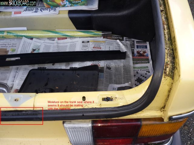 I used a flashlight and my fingers to search for moisture above the headlight assembly and I was sure I found some. I took a closer look at the trunk seal and it seemed like there was moisture along the top of it where I suppose the rubber should be mating with the trunk's sheet metal. Hmm.