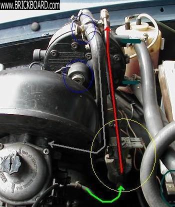 -an other view of the setup (blue circles adjustment screws again, green line is LPG from tank, yellow circle is the valve for the LPG, red line is short LPG line between valve and vaporiser, grey line is the gas line running to the carb.