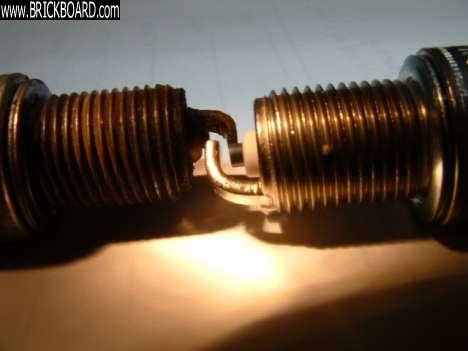 A pic of a plug from a purchase in 04. The plug on the left as compared to a new plug must be measured with a tape. This one could have had 130k on it with no poor running symptoms. It probably would had suffered a little with gas mileage but it was not in the car long enough to find out.
