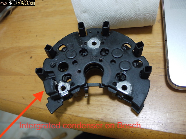 A much more simpler alternative is just to buy a condenser made for alternator and add it on your alternator. The value is around 250v/0.5 uF. Connect one of its wire to the B+ terminal and the other to alternator's body for ground. Photos of such items as below.