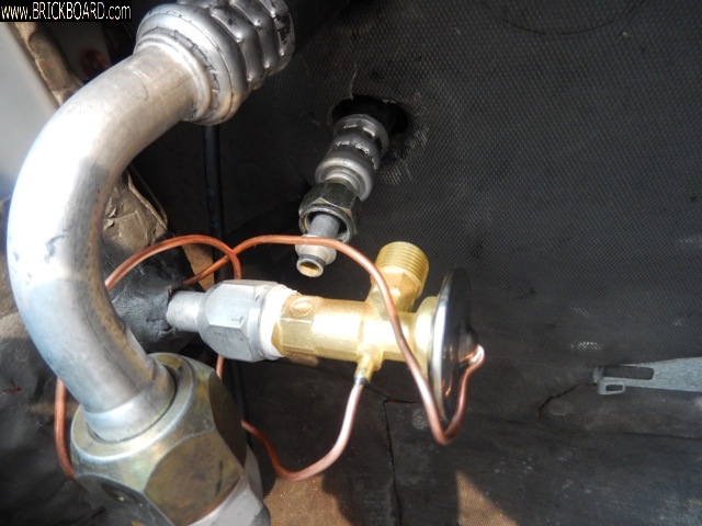 The compressor is in now and I am going around connecting the A/C lines. I have run into a fairly serious problem at the evaporator. The new evaporator I just installed the other day has an input arm, where the expansion valve mounts, that is too long. The threads on the TXV are now about 1.5-2" to the right of the hole in the firewall that the hose passes through. I can not get the hose to bend to accommodate this in the short distance between the firewall and TXV. It seems that the specs on this evaporator unit are a bit different from the original.