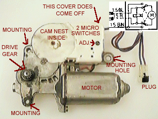 [Photo courtesy of Mike Ponte] With the motor out of the car, remove the white plastic cover over the switch cam (I'm making up names as I go here). It is held in place by three snap clips and is easy to remove. This will reveal a large (2+ in dia) white plastic cam disk that is driven by the motor/gearbox output gear. On this disk are three cams. There are black plastic cam followers that activate one microswitch each on the top and bottom cams. On the middle of the three cams there is a white plastic follower that moves a plastic leaf that in turn activates both microswitches. The black cam followers had fairly sharp points that rested on the surface of the cam, while the white one had a rather blunt point. My conclusion was that the white one had worn to the point that it no longer activated the microswitches reliably. To overcome this I glued a piece of cardboard (as in cereal box, although others may come up with a preferred method) to the ivory coloured plastic leaf the follower contacts. The cardboard was positioned so that the follower would contact it, thus compensating for the presumed wear to the tip of the follower. I then applied some grease to the surface of the cam with the hope of minimizing further wear and put everything back together.