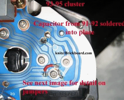 There is a capacitor in the area of the fuel gauge on the circuit board of the 91-92 cluster. It must be removed and then installed on the 93-94 circuit board. The capacitor from the 91-92 board is soldered into place on the 93-94 board.