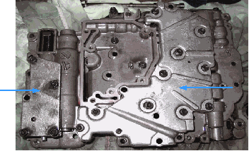Underside of valve body on bench. Front is to the left. The arrows point to the 2 covers. Remove 5 bolts to finally separate the upper and lower sections of the valve body. See step 4.