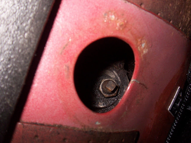 Next is the front band servo adjustment. The green book says to use a special spacer to set gap on the front servo adjustment, which of course I don't have. Some online sources say the proper gap is .25", others say 6mm, but the difference there works out to be only .35 millimeters. I used a 1/4" hex key as a spacer to set the gap. Just back off the locknut, screw the adjuster in or out until the hex key drags slightly in the gap, then snug the locknut back up.