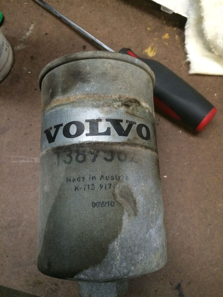 This was from my 760 but these fuel filters are identical to the 240s. It was impossible to blow through it and it was coated with some kind of black sludge. Replacing it made the car run good again. I replaced the original main fuel pump too but I be it was the filter that was the cause of it cutting out. Best guess is this filter had about 300,000 miles on it.