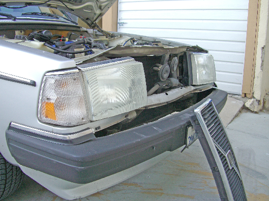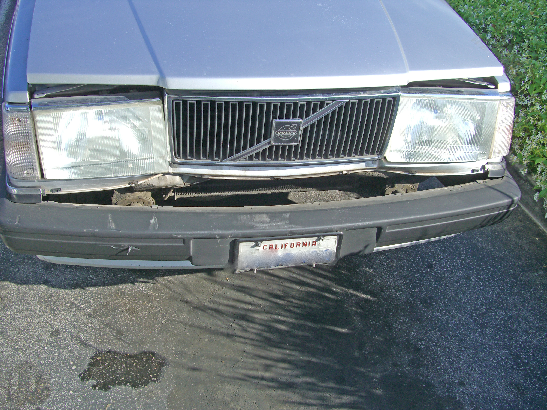 Headlights and grill? seem ok, but the body metal above them (containing the hood latch receptacle) and below them have been bent. The top part at least looks like it bolts in and could be replaced. The engine compartment does not seem to have been compromised and the car drives fine. The hood and fenders were not damaged.Can I just bolt in a new piece from a junkyard above the grill? Is the lower piece also bolt in or is it solid piece of the main chassis? Are there other places I should look for damage?