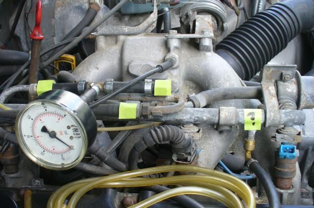 OK - Here's a shot of my 940 showing 2 options for fuel pressure gauge attachment. If your car has the one with the "?", you might find a gauge for $50 or less. But the fitting to connect it (like on a bicycle pump hose) could be scarce.